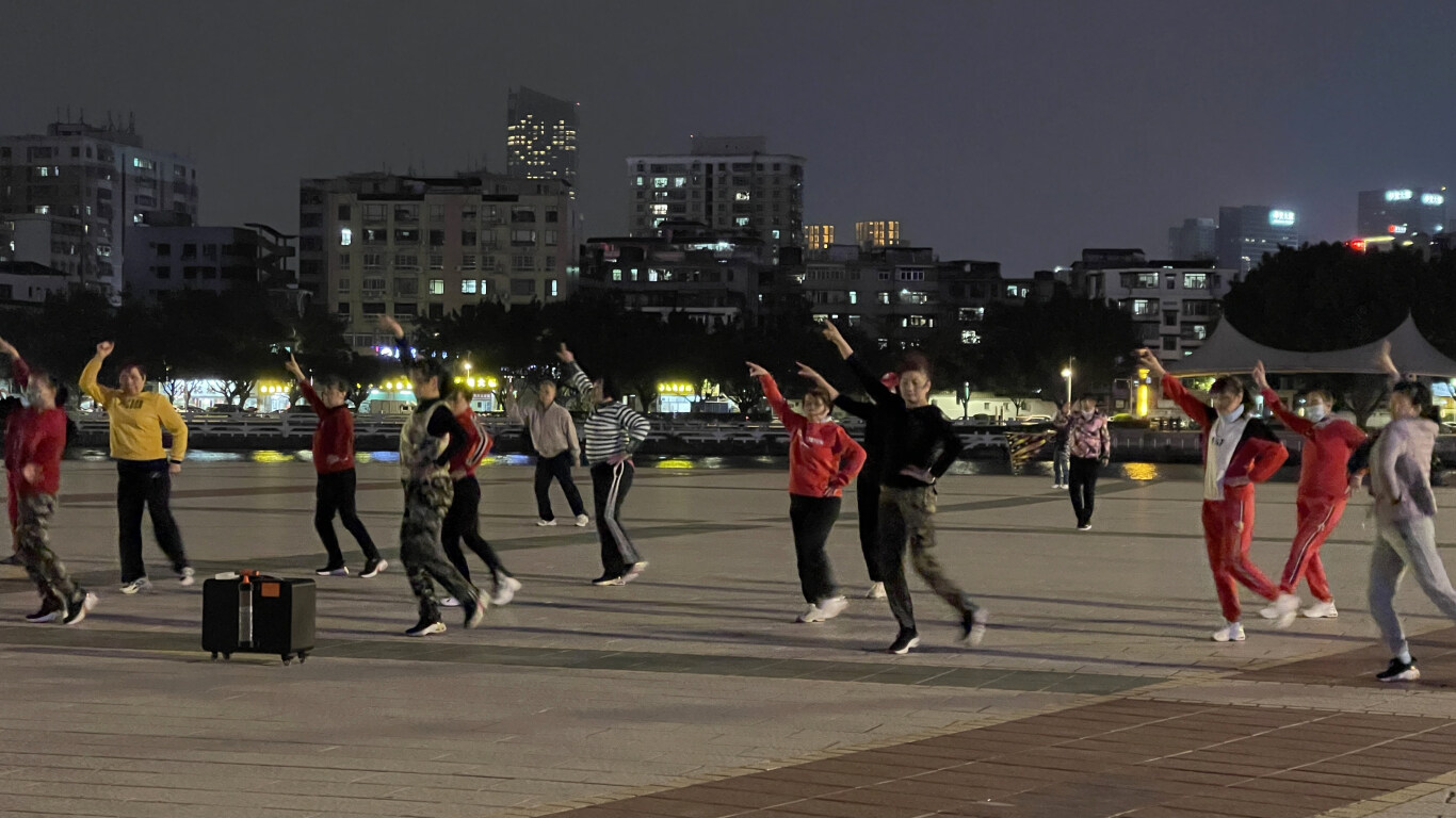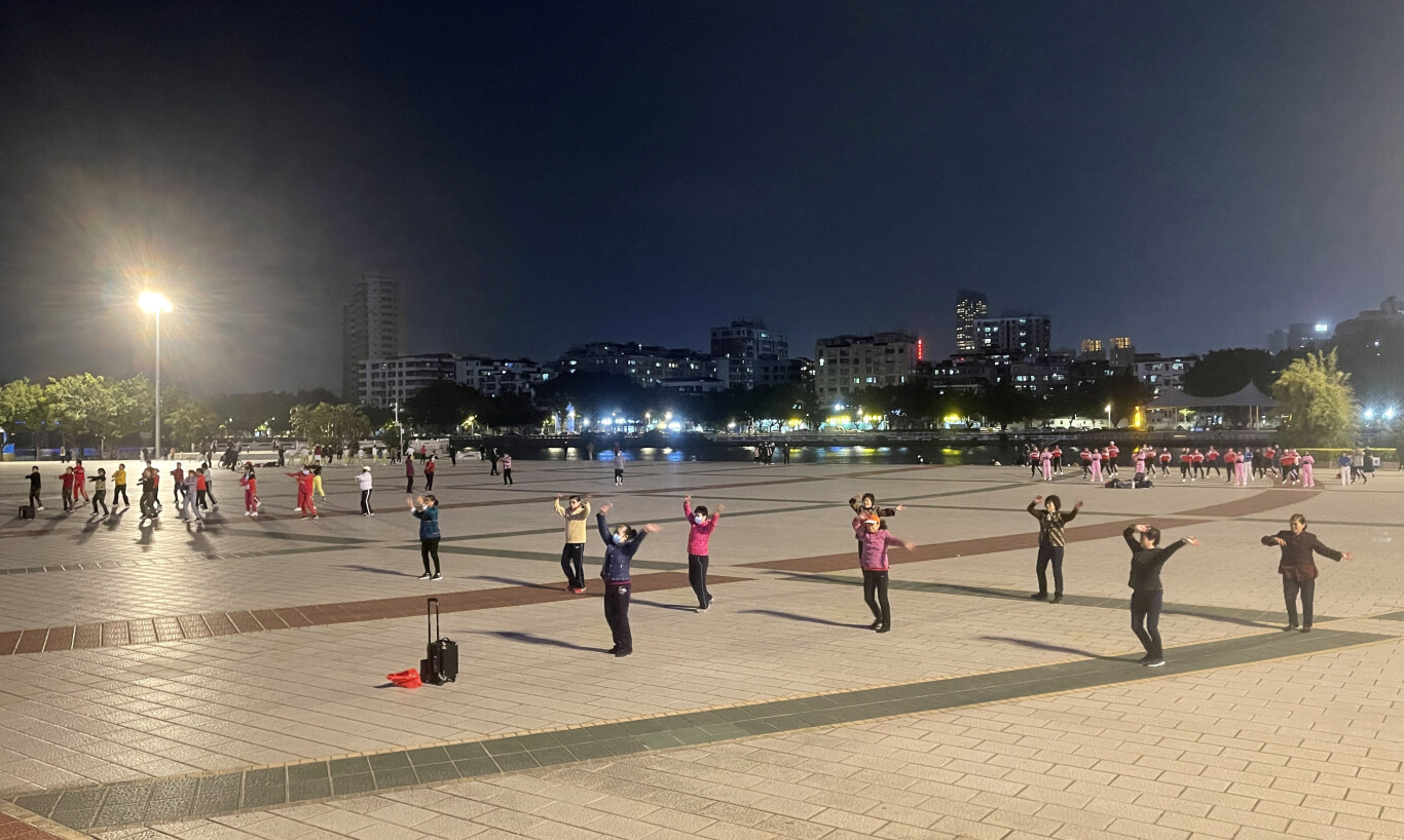 2月25日晚上8時許,僅濱江公園就有11支隊伍在跳廣場舞。