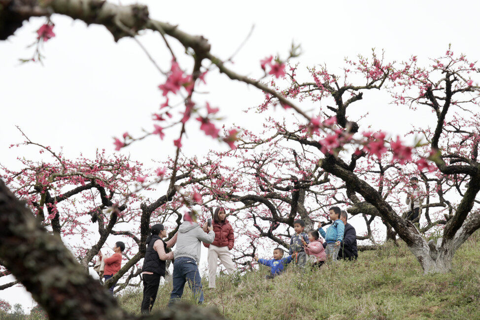 桃花盛開吸引大批游客前來賞花。