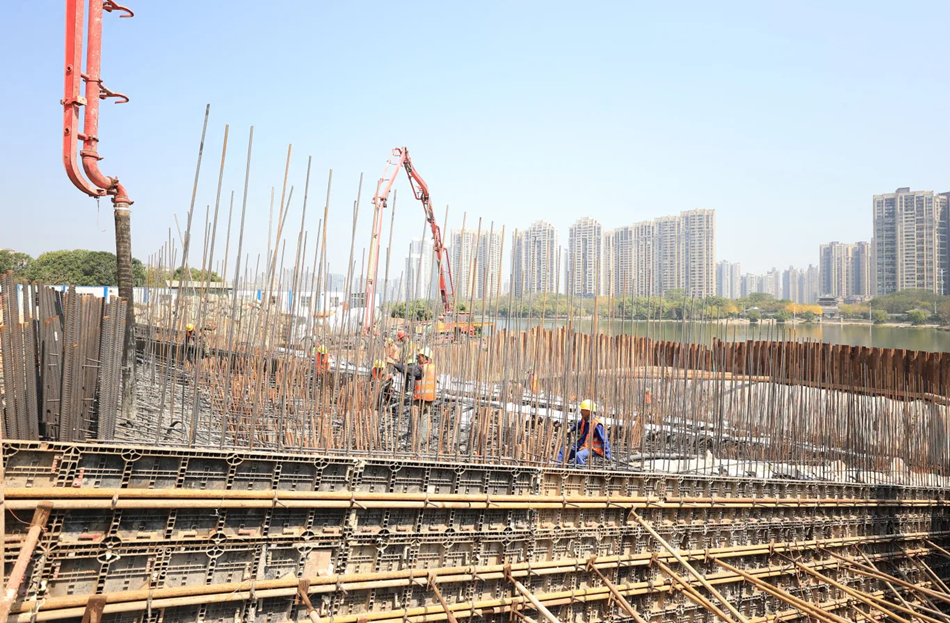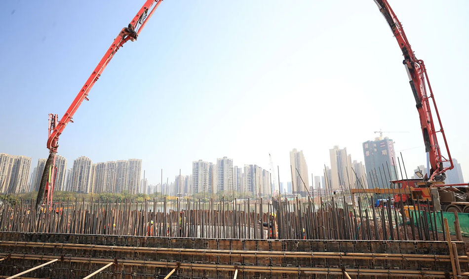 2月28日晚開(kāi)始承臺(tái)澆筑的是金山湖一號(hào)橋。記者3月1日上午在現(xiàn)場(chǎng)看到,混凝土天泵車(chē)伸出長(zhǎng)臂,將一車(chē)車(chē)混凝土澆筑到承臺(tái)內(nèi)。“我們正在進(jìn)行0號(hào)承臺(tái)的混凝土澆筑施工,橋梁共設(shè)置2個(gè)承臺(tái),承臺(tái)長(zhǎng)44.61米、寬36米、高4.5米,單個(gè)承臺(tái)混凝土方量為7300立方米!苯鹕胶惶(hào)橋項(xiàng)目副經(jīng)理鄧子敬介紹,金山湖一號(hào)橋橋梁全長(zhǎng)283米,為保證一次性跨越金山湖水道,橋梁設(shè)計(jì)凈跨達(dá)到196米,在相同結(jié)構(gòu)橋梁中,其跨度在全國(guó)位居前列。