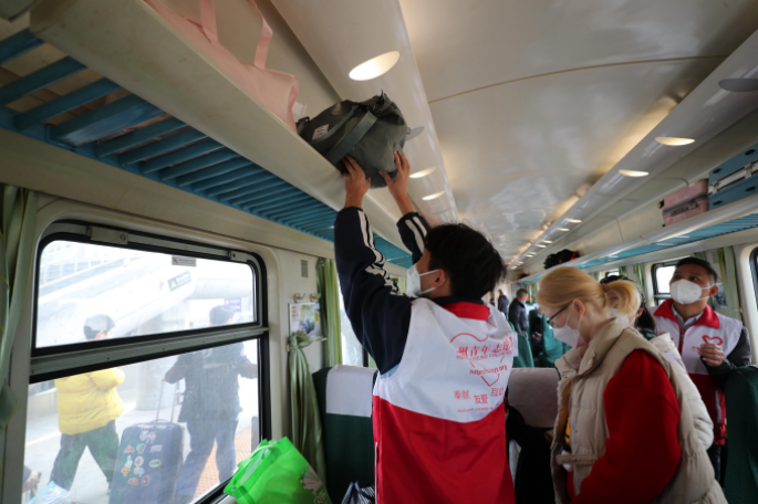 志愿者協(xié)助旅客順利找到座位。