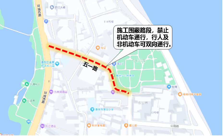 因市區(qū)五一路(位于中山公園西側(cè))道路改造工程施工需要,需對(duì)該道路進(jìn)行半幅圍蔽施工,為確保施工期間道路交通安全、有序、暢通,惠州市公安局交通警察支隊(duì)根據(jù)《中華人民共和國(guó)道路交通安全法》等有關(guān)法律法規(guī),對(duì)施工路段實(shí)施臨時(shí)交通組織。現(xiàn)通告如下:
