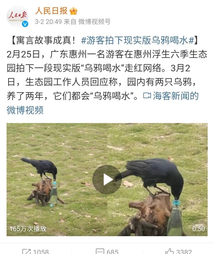 近日,一段拍攝于惠州羅浮山下浮生六季生態(tài)園的烏鴉喝水抖音視頻走紅網(wǎng)絡。視頻中,烏鴉不斷叼起草地上的石子,扔進玻璃水瓶中,待水升起后,烏鴉喝到了水。網(wǎng)友驚呼,“原來小學課文《烏鴉喝水》還真有現(xiàn)實版”。該視頻引來人民日報等眾多媒體爭相轉(zhuǎn)發(fā)報道,連日來占據(jù)熱搜位置。