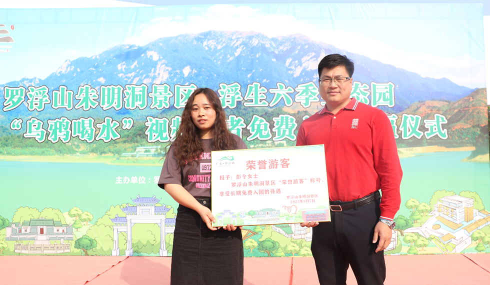 羅浮山朱明洞景區(qū)授予“烏鴉喝水”視頻作者彭令免費入園牌匾。