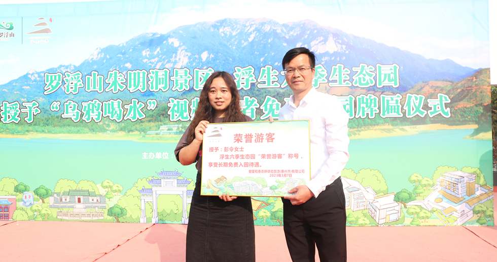 昨日下午,羅浮山朱明洞景區(qū)、浮生六季生態(tài)園聯(lián)合舉辦授予“烏鴉喝水”視頻作者免費入園牌匾儀式,將“榮譽游客”稱號授予視頻作者彭令女士,讓其享受長期免費入園待遇。