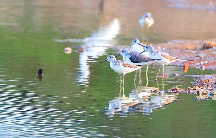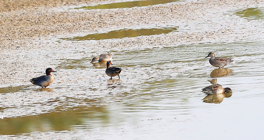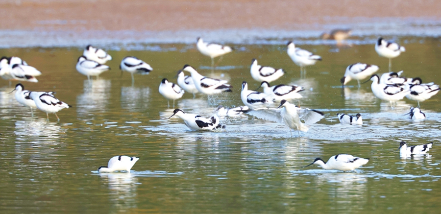 40來只黑臉琵鷺成一字隊(duì)形排開,200多只長腳反嘴鷸結(jié)隊(duì)向前推進(jìn),20多只琵嘴鴨、白鷺、灰鷺穿插群中,在惠城區(qū)三棟鎮(zhèn)西枝江畔一個(gè)水塘里共享饕餮盛宴。
