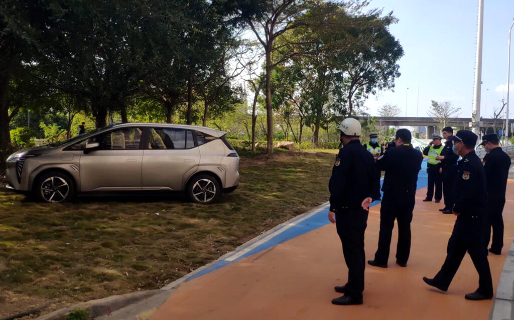 日前,在市區(qū)文頭嶺旭日路,一輛電動汽車違停在一塊公共綠地上,執(zhí)法人員已對其進行立案,處罰金額3392元。