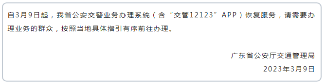 3月9日,廣東交警發(fā)布公告稱交警業(yè)務(wù)辦理系統(tǒng)(含“交管12123”APP)恢復(fù)服務(wù)。