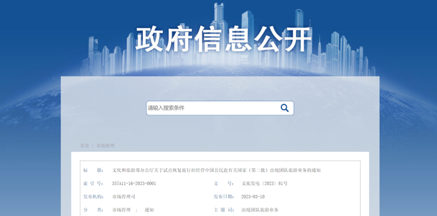 2023年3月15日起,試點(diǎn)恢復(fù)全國旅行社及在線旅游企業(yè)經(jīng)營中國公民赴有關(guān)國家(第二批)出境團(tuán)隊(duì)旅游和“機(jī)票+酒店”業(yè)務(wù)。