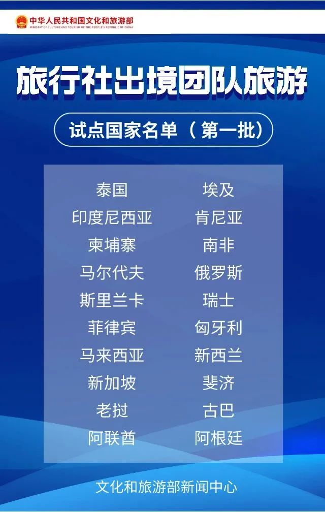 據(jù)了解,此前,文旅部曾公布第一批試點(diǎn)恢復(fù)出境游和相關(guān)業(yè)務(wù)的20個(gè)國家: