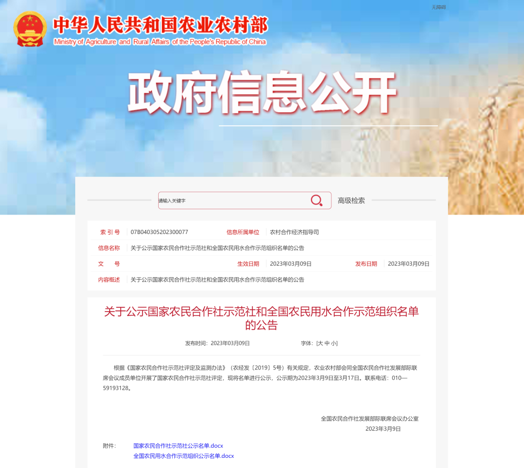 農(nóng)業(yè)農(nóng)村部發(fā)布消息稱,根據(jù)《國家農(nóng)民合作社示范社評定及監(jiān)測辦法》(農(nóng)經(jīng)發(fā)〔2019〕5號)有關(guān)規(guī)定,農(nóng)業(yè)農(nóng)村部會同全國農(nóng)民合作社發(fā)展部際聯(lián)席會議成員單位,開展了國家農(nóng)民合作社示范社評定,并對名單進行公示,公示期為2023年3月9日至3月17日。