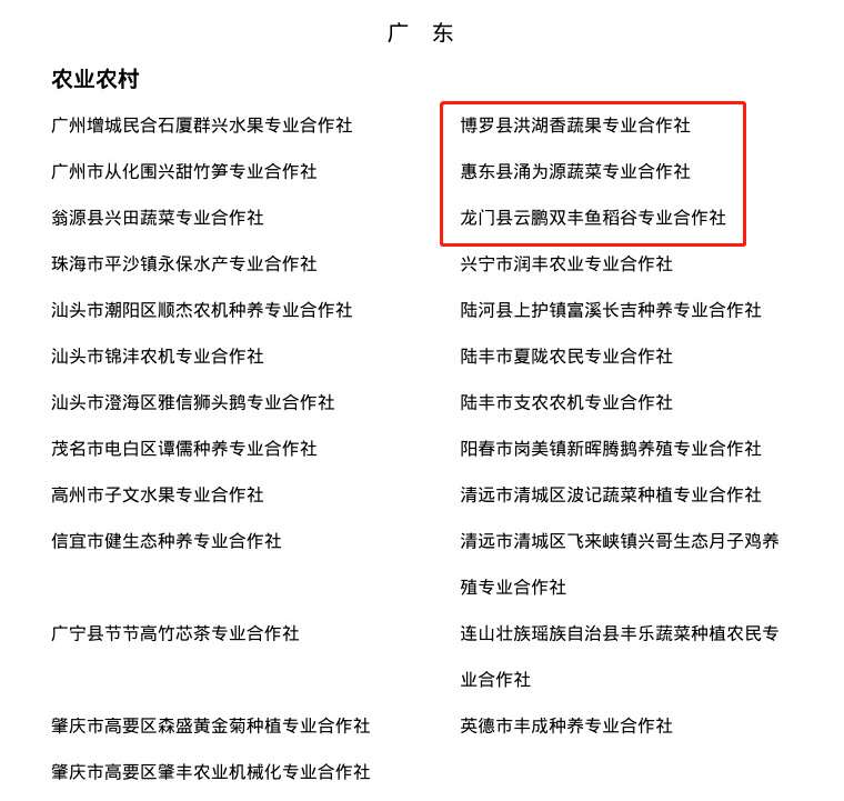 3月9日,新一批國家農(nóng)民合作社示范社評定名單進行公示,惠州3家合作社入選公示名單,分別為博羅縣洪湖香蔬果專業(yè)合作社、惠東縣涌為源蔬菜專業(yè)合作社、龍門縣云鵬雙豐魚稻谷專業(yè)合作社。