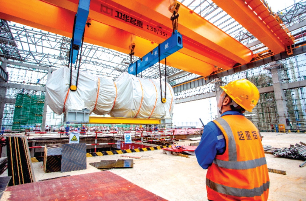 1號(hào)機(jī)組燃?xì)廨啓C(jī)現(xiàn)場(chǎng)起吊施工;葜萑?qǐng)?bào)記者匡湘鄂 通訊員楊秀清 攝