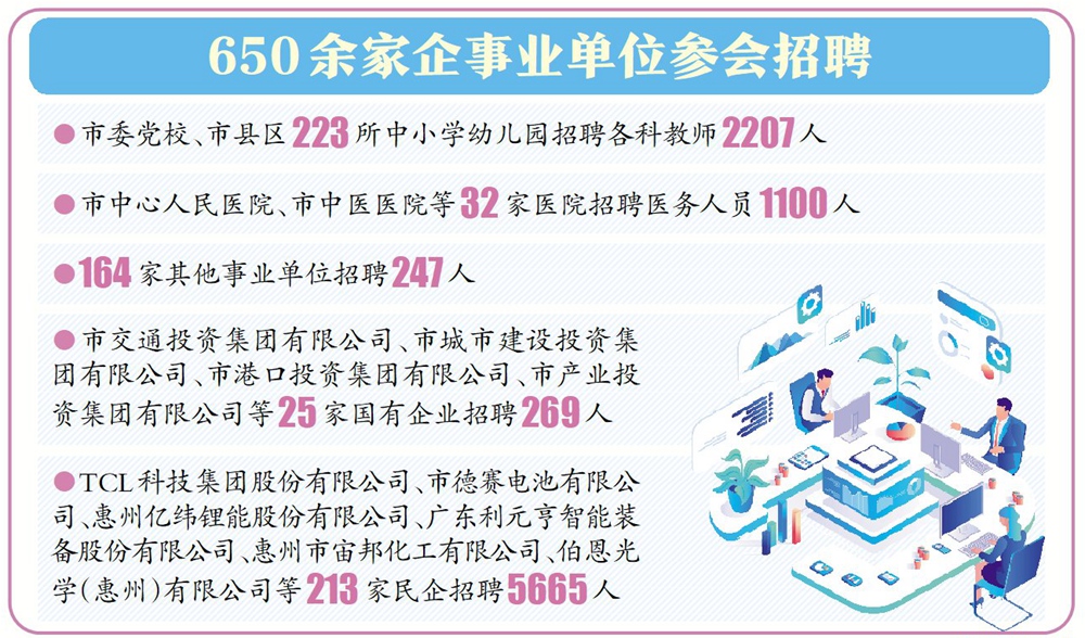 據(jù)了解,本次共有650余家企事業(yè)單位參會(huì),具體包括市委黨校、市縣區(qū)223所中小學(xué)幼兒園招聘各科教師2207人;市中心人民醫(yī)院、市中醫(yī)醫(yī)院等32家醫(yī)院招聘醫(yī)務(wù)人員1100人;164家其他事業(yè)單位招聘247人;市交通投資集團(tuán)有限公司、市城市建設(shè)投資集團(tuán)有限公司、市港口投資集團(tuán)有限公司、市產(chǎn)業(yè)投資集團(tuán)有限公司等25家國(guó)有企業(yè)招聘269人;TCL科技集團(tuán)股份有限公司、市德賽電池有限公司、惠州億緯鋰能股份有限公司、廣東利元亨智能裝備股份有限公司、惠州市宙邦化工有限公司、伯恩光學(xué)(惠州)有限公司等213家民企招聘5665人。