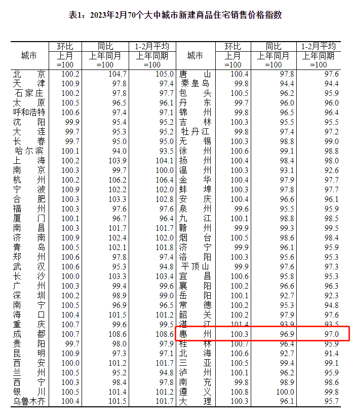 惠州日報訊 (記者邱若蓉 通訊員羅杰)國家統(tǒng)計局日前公布《2023年2月份70個大中城市商品住宅銷售價格變動情況》,惠州新建商品住宅銷售價格環(huán)比指數(shù)為100.3,即環(huán)比上漲0.3%。這是自去年8月以來的首次轉正。
