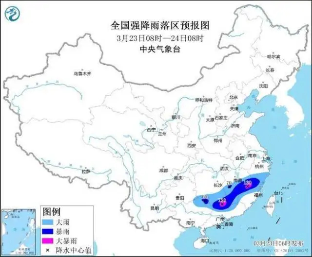 中央氣象臺3月23日06時發(fā)布暴雨藍色預(yù)警: