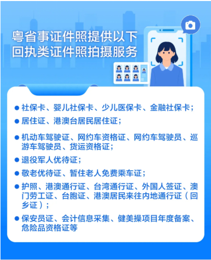為提升業(yè)務(wù)辦理效率,讓市民平日拍照、辦證少跑腿、自主掌上辦,粵省事匯聚整合一站式便民服務(wù),提供證件照拍攝、在線獲取回執(zhí)即拍即用、辦證換領(lǐng)服務(wù),不扎堆、免排隊(duì)、免奔波,實(shí)現(xiàn)足不出戶拍照+辦證一次全搞定!