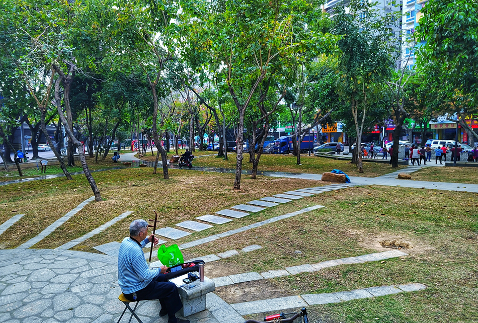 鄧伯是梅州人,來惠10多年了,“我感覺惠州這座城市是最好的,空氣、水質(zhì)、環(huán)境都很好”,特別是口袋公園建好后,綠化環(huán)境和各種設施比從前好多了,尤其是公園廁所特別干凈!按蠹以谶@里吹拉彈唱,心情也好啊”,說罷,他臉上蕩漾著幸福的笑容,隨著他奏響樂器,孩童不自覺在跟前手舞足蹈,一幅喜悅祥和的畫面……