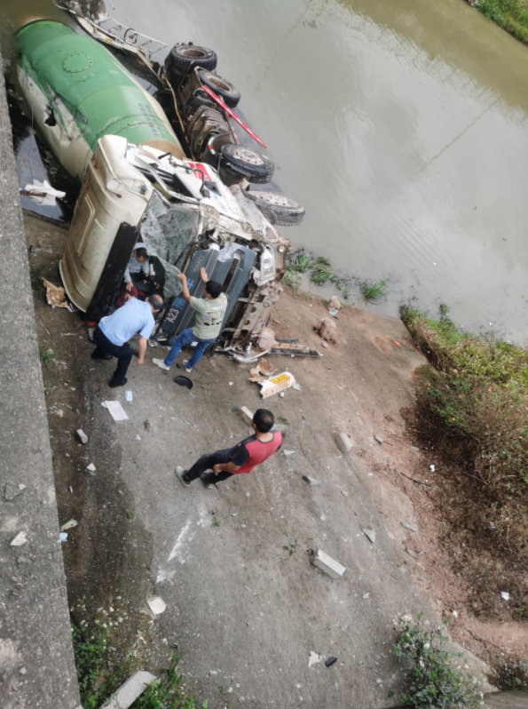 “之前車開得好好的,進入輔路沒多久就聽到巨響!笔Y加虎說,3月24日上午,他和同事曾瑩一起前往仲愷高新區(qū)開展廢水“零排放”執(zhí)法行動。事發(fā)前,他們的車跟在攪拌車后面,前后也就相差30多米的距離。進入輔路準(zhǔn)備右轉(zhuǎn)上橋的時候,看到前面的攪拌車撞到停在橋上的車后,沖破圍欄掉到河里去了。