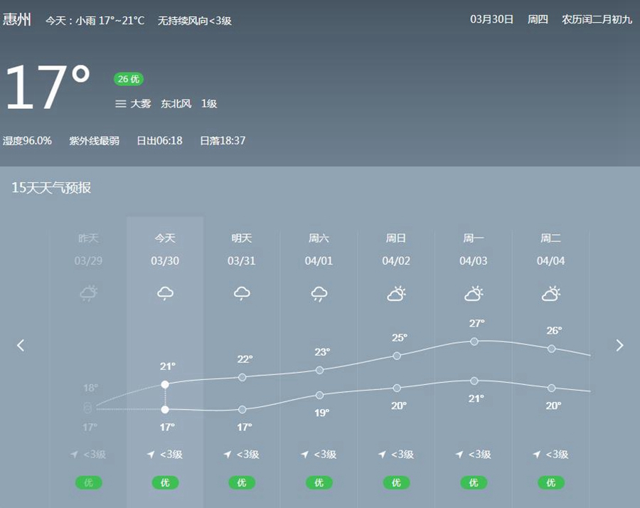 市氣象臺預(yù)計,3月30日,北部有大雨局部暴雨,南部中到大雨,氣溫18℃~22℃;31日,陰天,局部有陣雨,氣溫18℃~25℃;4月1日~4日,陰天,有陣雨或雷陣雨,早晚有輕霧或霧,氣溫持續(xù)回升。