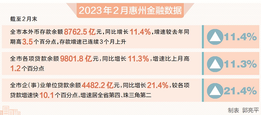 根據(jù)中國人民銀行惠州市中心支行發(fā)布的《2023年2月惠州金融運行分析》,今年以來,惠州金融業(yè)運行穩(wěn)健,其中,存款增速連續(xù)3個月回升,各項貸款投放穩(wěn)定增長,經(jīng)濟重點領域和薄弱環(huán)節(jié)持續(xù)得到較大支持。