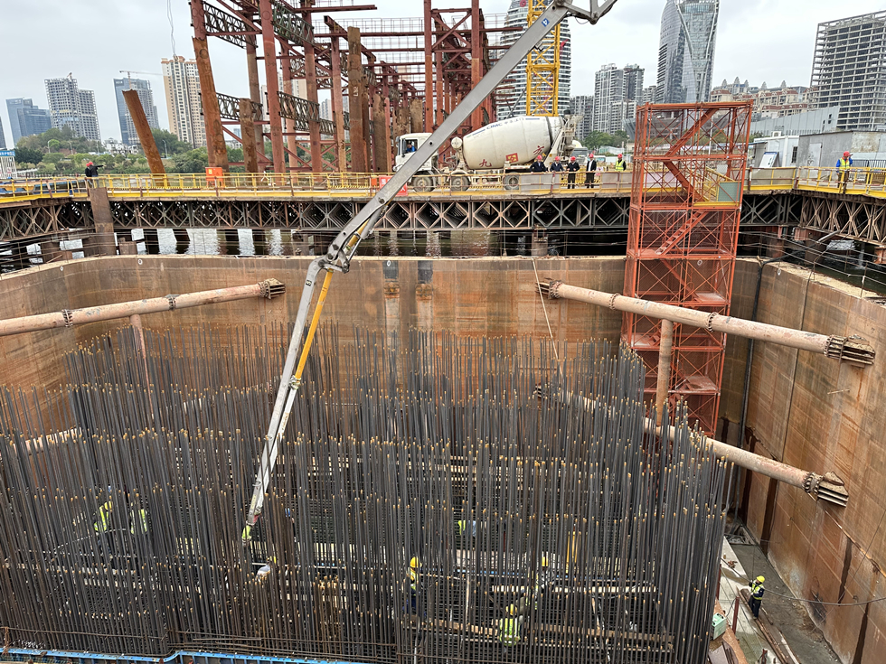 連日的陰雨天氣,沒有澆滅項(xiàng)目施工的大干熱潮,施工人員風(fēng)雨無阻,冒雨24小時施工,比原計(jì)劃提前3天完成本次墩身澆筑。ZP3墩身澆筑混凝土量高達(dá)5105立方,是全橋墩柱鋼筋綁扎量最大、難度最高的墩柱。根據(jù)項(xiàng)目施工方案,ZP3墩身將分成6次澆筑,預(yù)計(jì)6月完成澆筑。