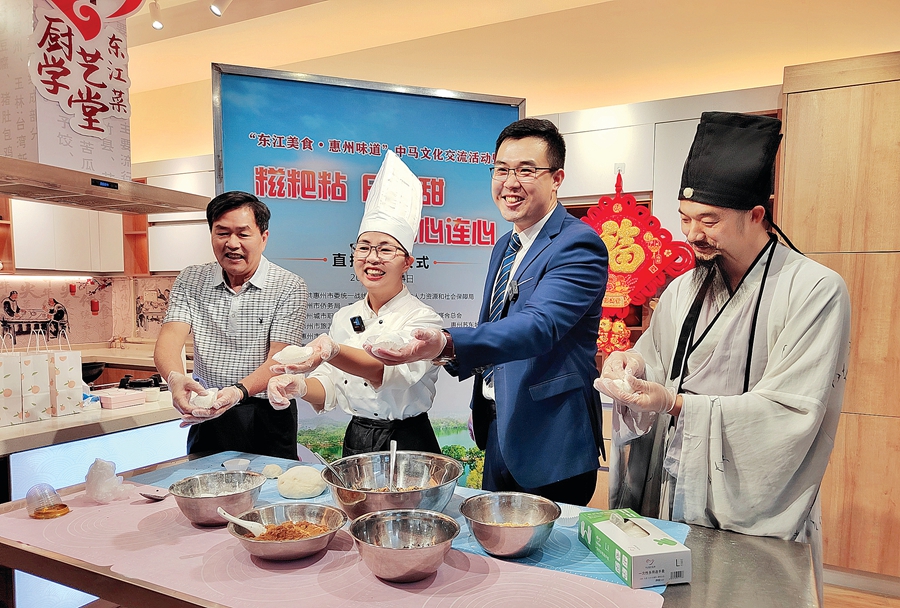 “東江美食·惠州味道”中馬文化交流活動以“線下團聚+線上直播”的方式制作分享客家美食糍粑。 惠州日報記者朱金贊 攝