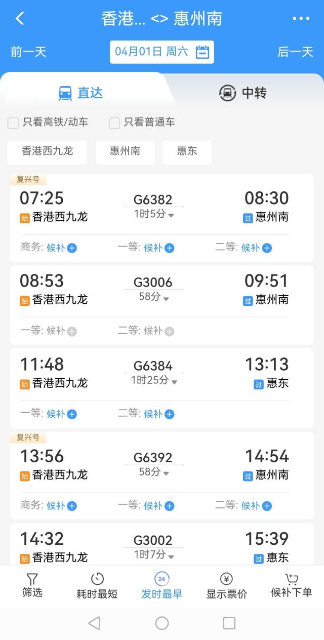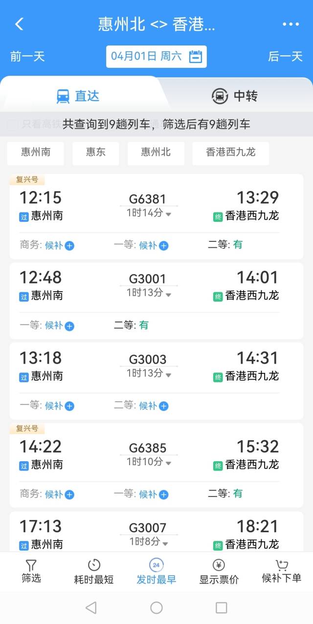 3月30日下午,記者在12306網(wǎng)站查到,4月1日起惠州每日有9趟高鐵到香港西九龍,包括惠州北站1趟、惠州南站7趟、惠東站1趟。