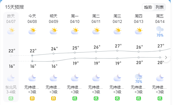 具體來說,今天白天,陰天到多云,最高氣溫22℃左右;9-10日,多云天氣為主,氣溫16~25℃;11-12日,多云到陰天,氣溫18~27℃;13-15日,多云到陰天,局部有陣雨。