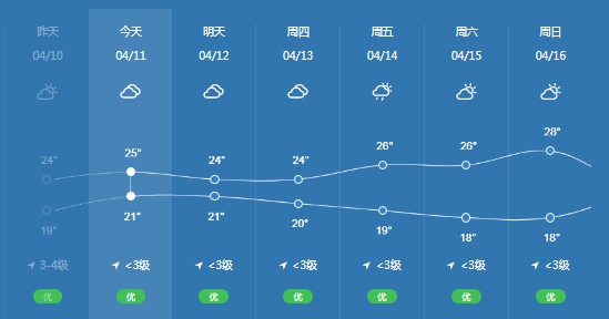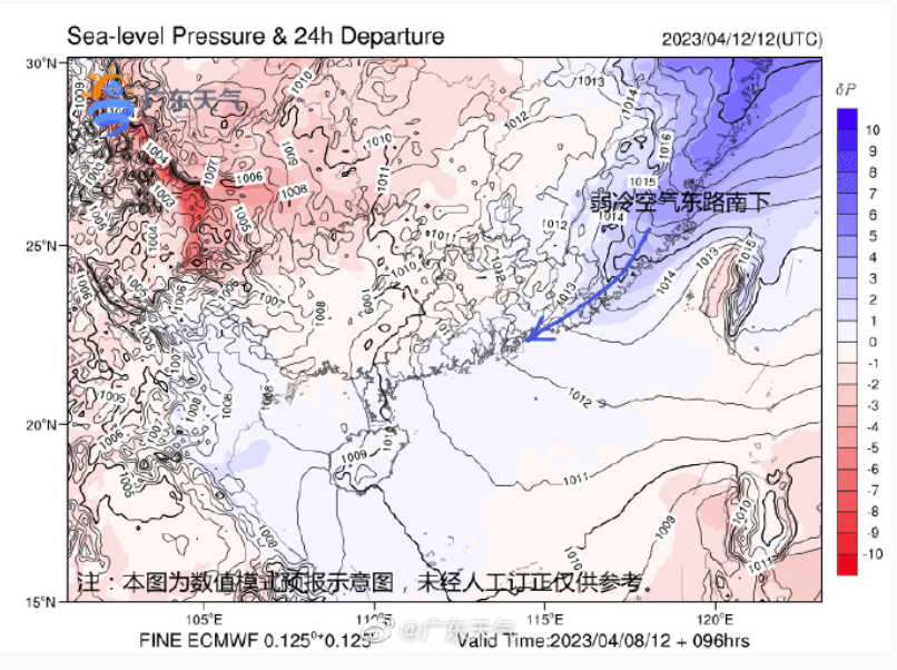 4月11日夜間有弱冷空氣滲透影響粵北,陣雨趨多,其余地區(qū)多云到陰天為主,偶有分散陣雨,粵北粵東氣溫小幅下降。