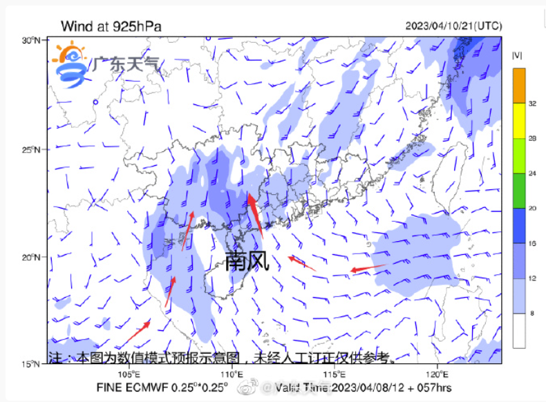4月11日,中層廣東處副高北側(cè)偏西北氣流中;低層偏南氣流活躍,廣東云量較多(多云到陰天為主),西部市縣偶有分散小雨,部分時間有陽光,氣溫逐日上升。