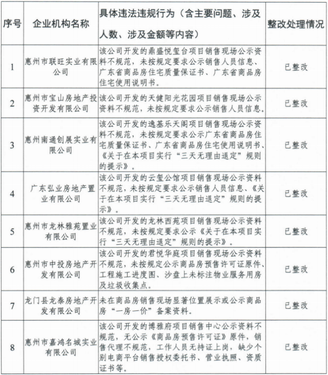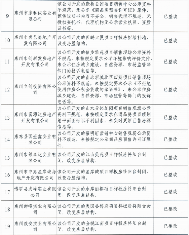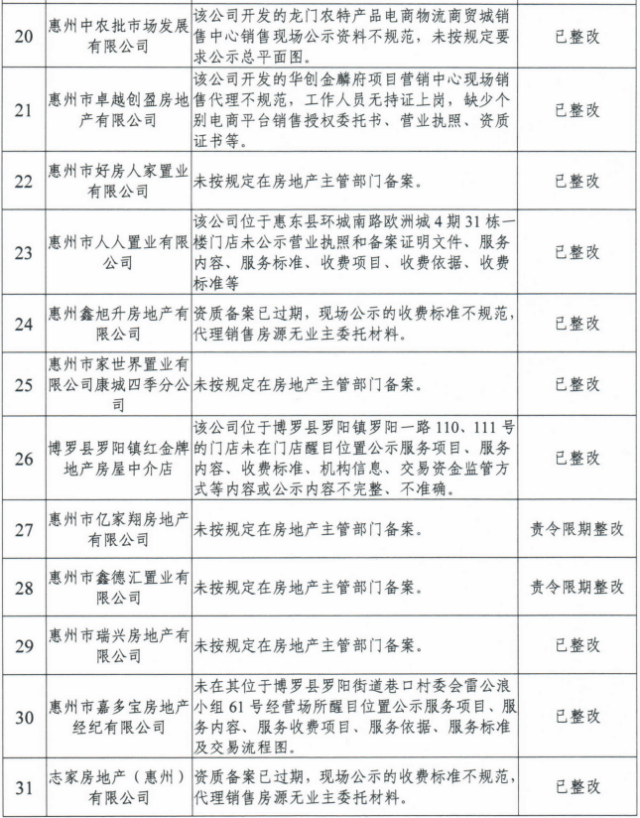 11家房地產(chǎn)中介機(jī)構(gòu)分別為惠州好房人家置業(yè)、人人置業(yè)、鑫旭升房產(chǎn)、家世界置業(yè)、羅陽(yáng)鎮(zhèn)紅金牌地產(chǎn)房屋中介店、億家翔房產(chǎn)、鑫德匯置業(yè)、瑞興房地產(chǎn)、嘉多寶房產(chǎn)、志家房產(chǎn)以及宜樂(lè)居實(shí)業(yè)公司,涉及的違法違規(guī)行為主要集中為未按規(guī)定進(jìn)行備案或備案資質(zhì)過(guò)期,從業(yè)人員未實(shí)名登記、門(mén)店信息公示不規(guī)范等行為。截至目前,除惠州市億家翔房地產(chǎn)有限公司、惠州市鑫德匯置業(yè)有限公司、惠州市瑞興房地產(chǎn)有限公司尚未完成整改,處被責(zé)令限期整改中外,其余8家機(jī)構(gòu)均已完成整改。