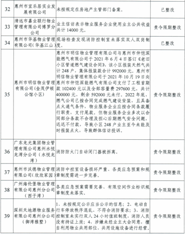 根據(jù)《公告》內(nèi)容,11家違法違規(guī)的物業(yè)企業(yè)中,目前僅有惠州市華基物業(yè)管理有限公司完成了違規(guī)行為的整改,廣東龍光集團(tuán)物業(yè)管理有限公司、惠州隆生物業(yè)管理有限公司等10家企業(yè)均被責(zé)令限期整改,尚處于整改過(guò)程中。