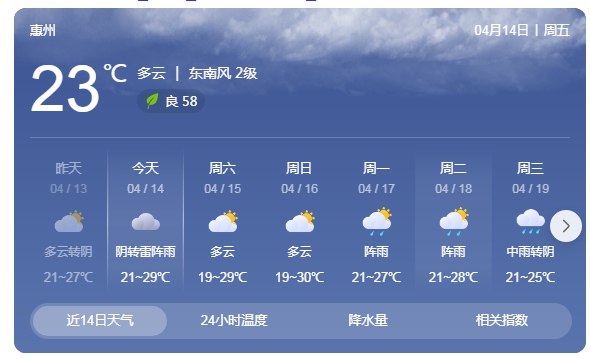 惠州日報訊 (記者周智聰)惠州市氣象臺昨日發(fā)布惠州強(qiáng)對流天氣提醒,預(yù)計14日白天我市各地陰天間多云,北部地區(qū)傍晚前后轉(zhuǎn)雷陣雨;14日夜間至15日凌晨我市北部有中到大雨,中南部雷陣雨,并伴有短時強(qiáng)降水和局地雷暴大風(fēng)等強(qiáng)對流天氣;展望15日白天至17日,降水結(jié)束,以多云天氣為主。