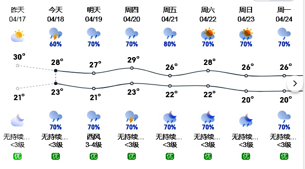 惠州日報訊 (記者周智聰)近兩日天氣晴好、炎熱,最高氣溫超過30℃;葜菔袣庀笈_預計4月18日開始降雨趨于頻繁,又是雨雨雨的天氣啦!