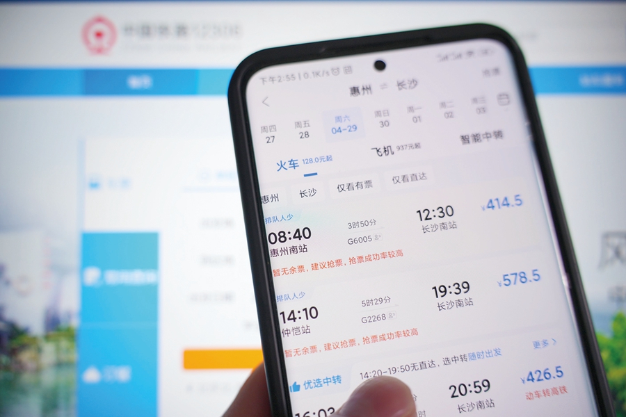 “五一”假期惠州往長沙方向多趟車次車票顯示售罄。
