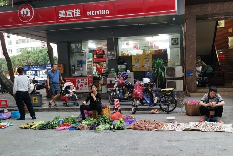 隨后,記者在惠城區(qū)河南岸街道斑樟湖一橫街看到,幾名商販把蔬菜水果等擺在機動車道上。當時正值上下班高峰,陸續(xù)有汽車、電動車避讓通過。