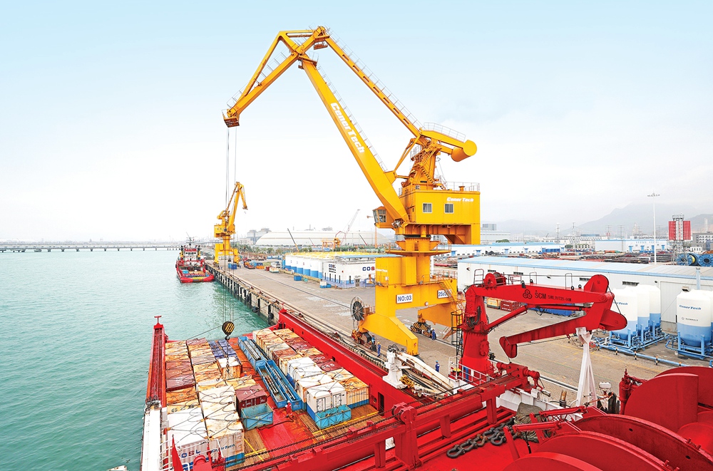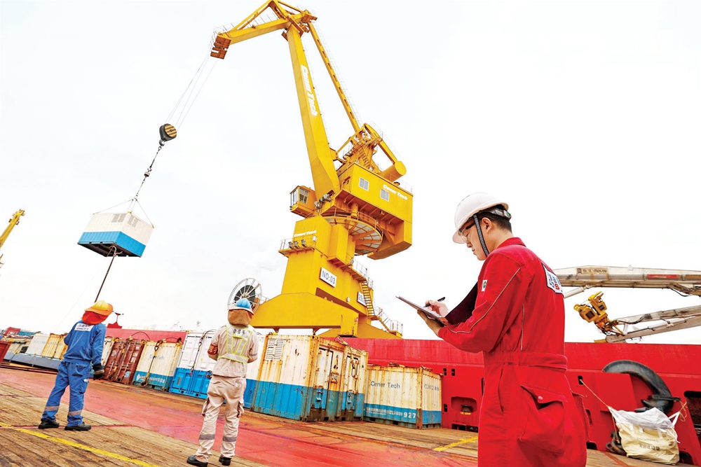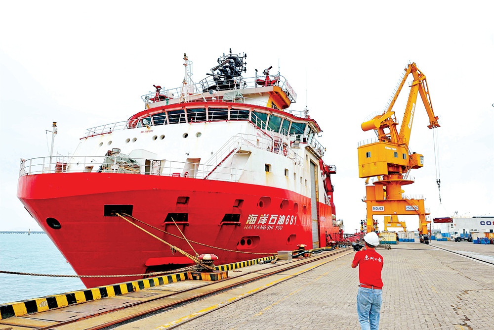 “海洋石油681”在裝載給海上鉆井平臺(tái)補(bǔ)給的物資。