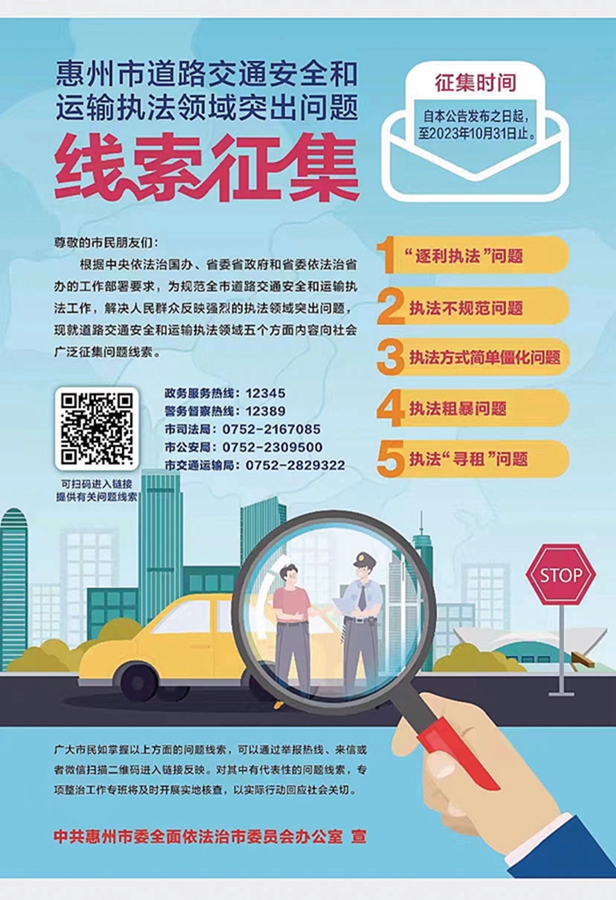 惠州市道路交通安全和運輸執(zhí)法領(lǐng)域突出問題線索征集宣傳海報。