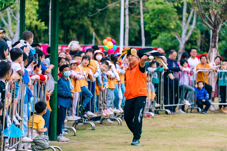 園區(qū)的動物“明星”還有很多。走過園區(qū)的吊橋就是百鳥園。百鳥園的旁邊是一片大草坪。園區(qū)每天上午和下午在這里都有表演。最近紅遍全網的烏鴉喝水視頻,就是一名游客在這里拍攝的。當天,園區(qū)來了三四個研學團的學生。在園區(qū)工作人員的引領下,烏鴉喝水和飛行編隊的表演開始進行。聰明的烏鴉將石子一粒粒投進瓶子里,最終成功喝到了水。工作人員一吹哨子,一群群的鳥兒先后飛了出來,非常有氣勢。最先出來的一群萌萌的珍珠雞,第二是孔雀,最后一只巨嘴鳥滑翔出來,在工作人員的引導下,和學生們互動。學生們看到表演,發(fā)出一陣陣的歡呼!坝趾每从置龋 币晃恍W生說道。