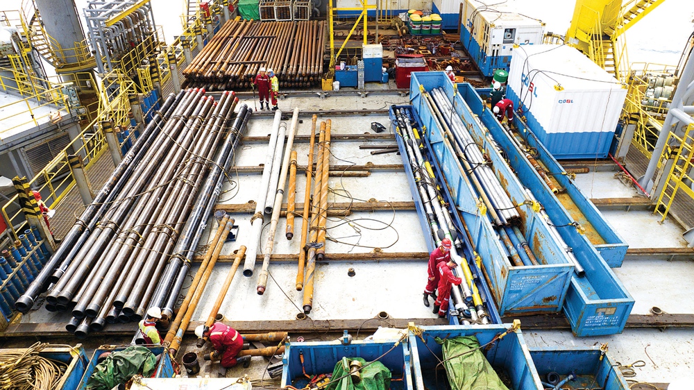 “國瑞”平臺(tái)甲板上,海洋石油工人在緊張忙碌保養(yǎng)鉆具。