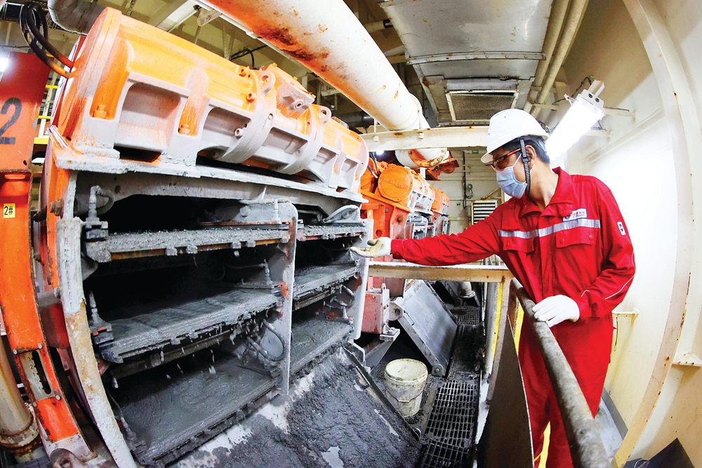 海洋石油工人在“國瑞”平臺(tái)振動(dòng)篩房觀察返出巖屑。