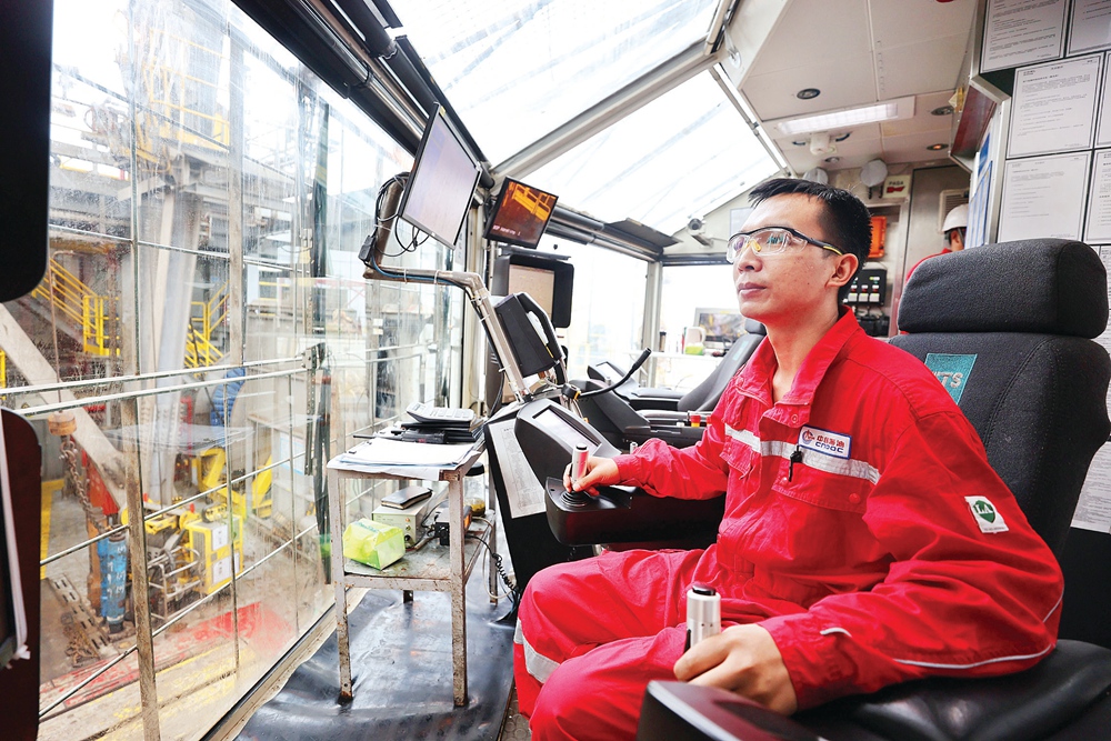 司鉆房堪比“國瑞”平臺(tái)的“心臟”,這也是“國瑞”平臺(tái)最核心的區(qū)域。圖為司鉆正在全神貫注操作鉆井設(shè)備。