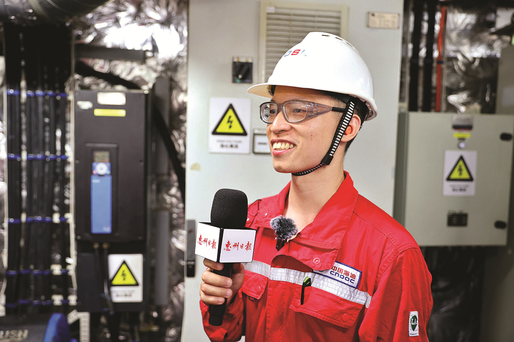 “國瑞”平臺配電房,設(shè)備主管向惠州日報記者介紹平臺設(shè)備。