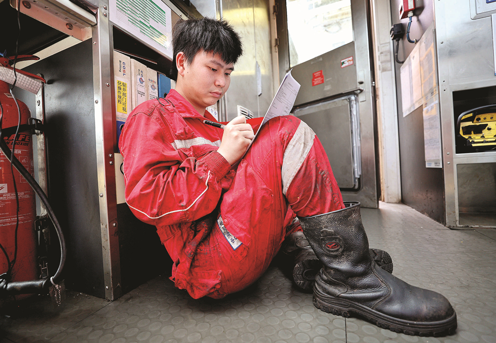 他們是機艙里的輪機員,每隔一兩個小時,就要頂著近40度高溫與超大噪聲巡檢一遍機艙設(shè)備,出來便是一身汗,如此反復接受“冰與火”的淬煉;
