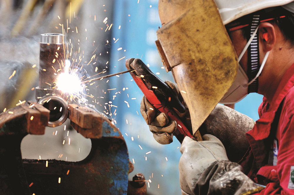 “國瑞”平臺配件制作區(qū)域,電焊工在焊接設(shè)備配件。