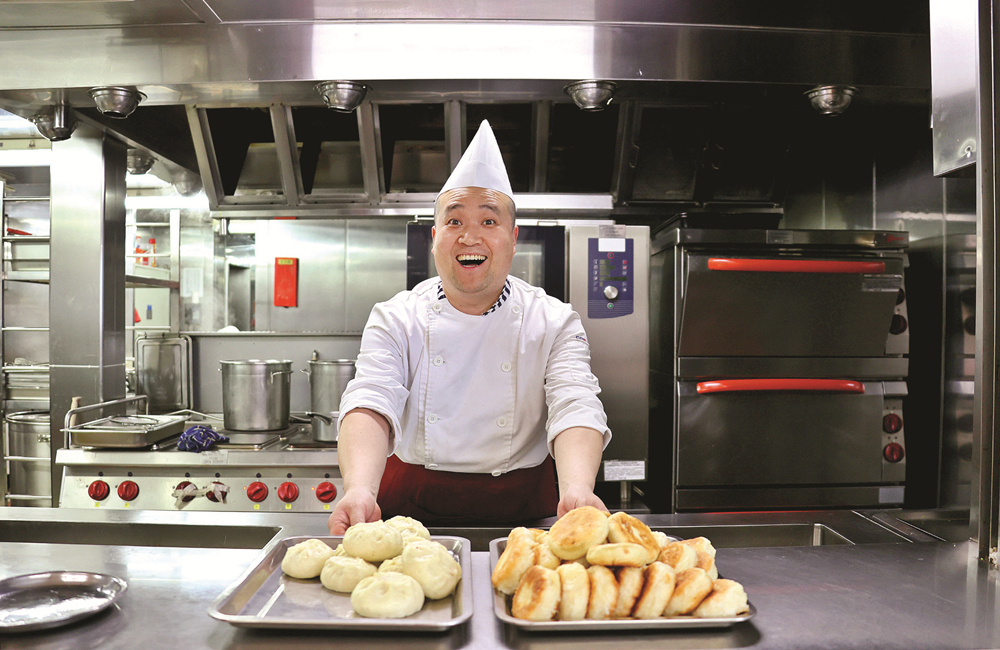 “國瑞”平臺生活區(qū),大廚為工人制作出可口的包子和肉餅。