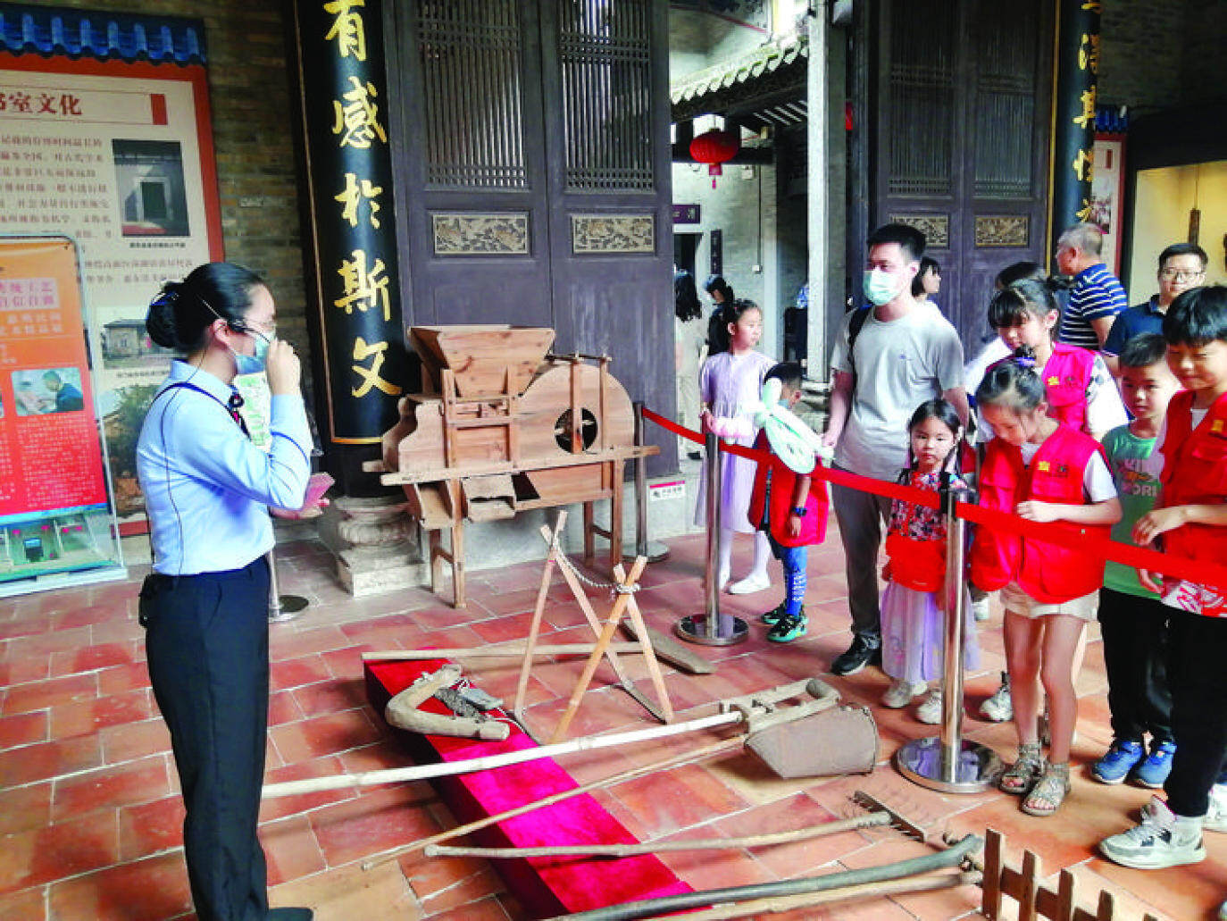 在東江民俗文物館“傳統(tǒng)農(nóng)具體驗(yàn)區(qū)”,講解員向小朋友們普及農(nóng)耕用具知識(shí)。 惠州日?qǐng)?bào)記者曾鏡明 攝