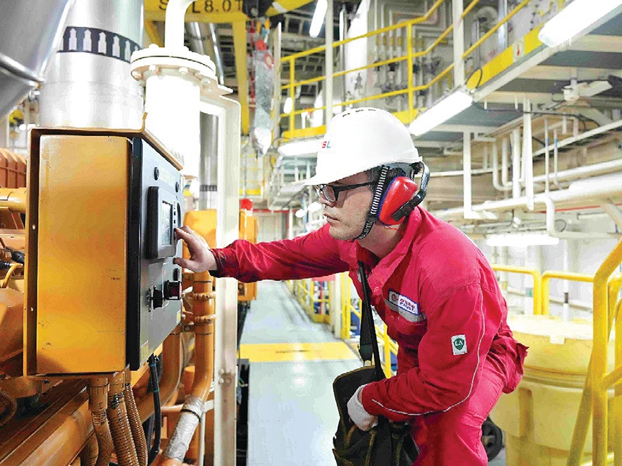 因為崗位的特殊性,我們每過兩小時就要頂著熱浪走進輪機艙進行一次設(shè)備全面巡檢,有時候感覺監(jiān)控參數(shù)有異常也會立馬進去看看,通常一天要被汗水浸濕4到5套衣服。在近10年的輪機工作里,我們正常上班是12小時,常態(tài)值班是24小時。盡管每天的工作生活如在冰與火中交替,但能為祖國找到更多的石油,保障國家能源安全,我覺得做的這些,都太值得了。