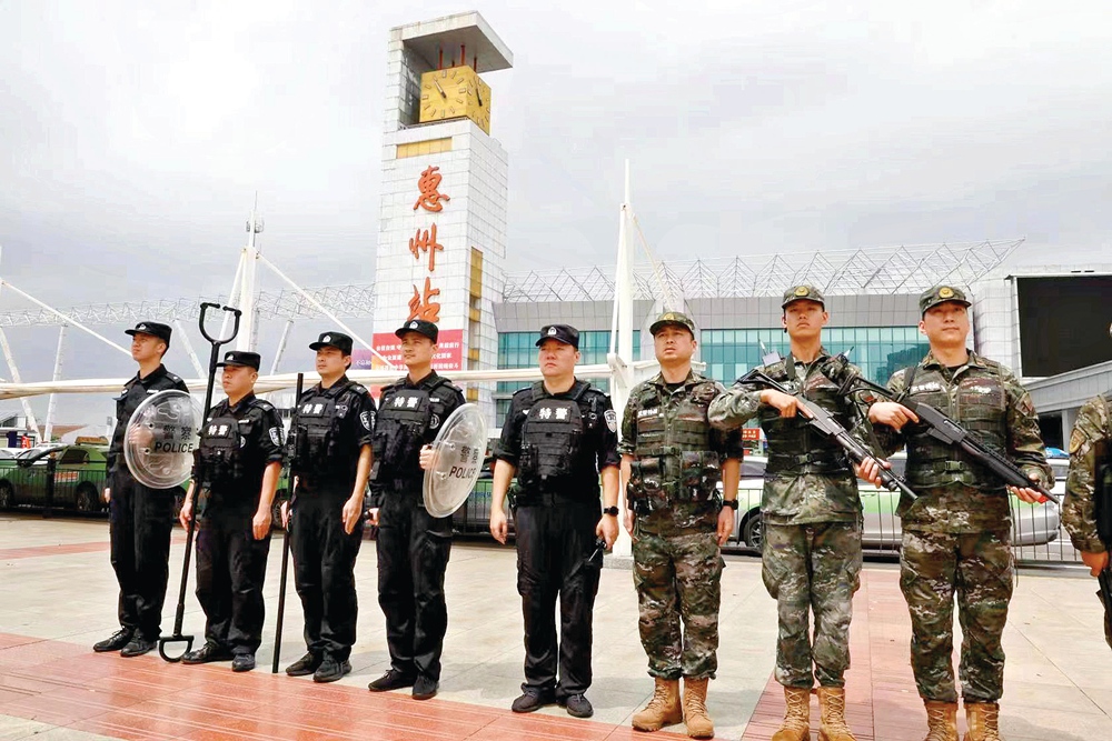 惠州公安特警聯(lián)合武警官兵在惠州火車站巡邏執(zhí)勤。