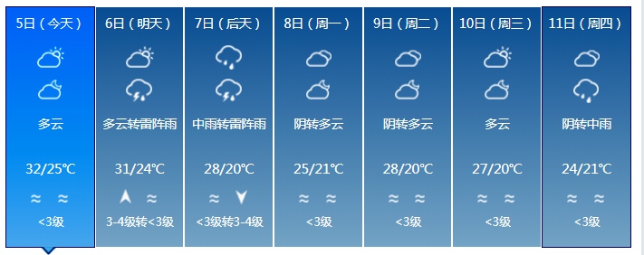 預(yù)計(jì)5月5日,多云間陰天,氣溫24~32℃;